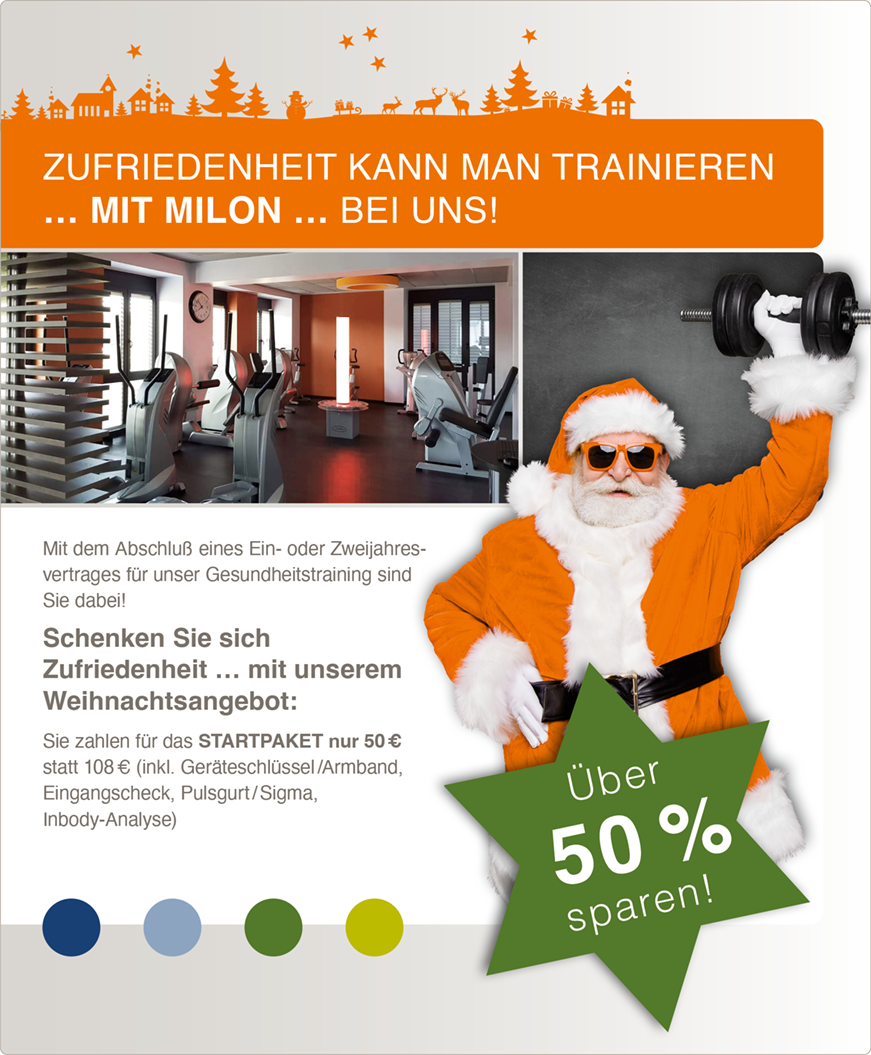 Wir bieten Ihnen Gesundheitsvorsorge und Steigerung Ihrer körperlichen Leistungsfähigkeit. Starten Sie Ihr Gesundheitstraining mit unserem modernen MILON-REMIUM-ZIRKEL. Ein innovatives Trainingskonzept und viele nette Leute erwarten Sie. |